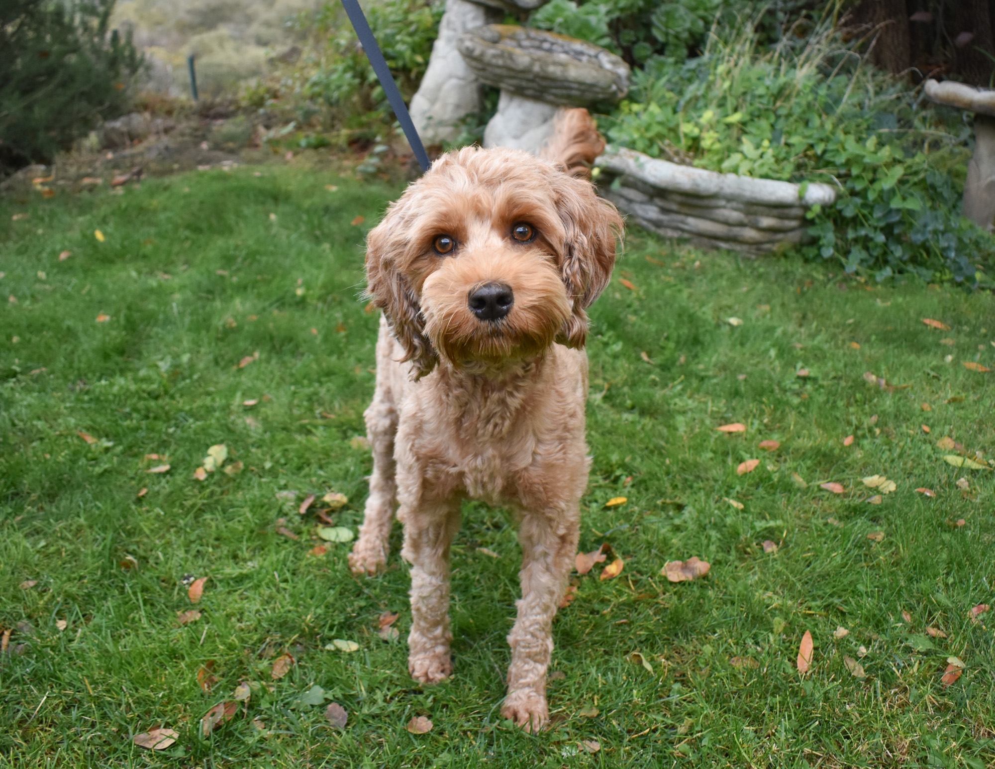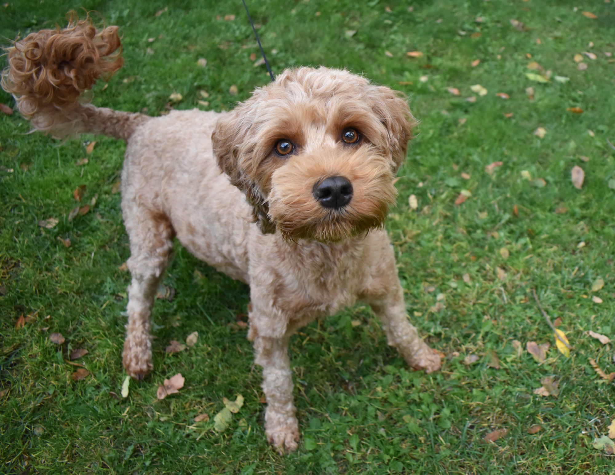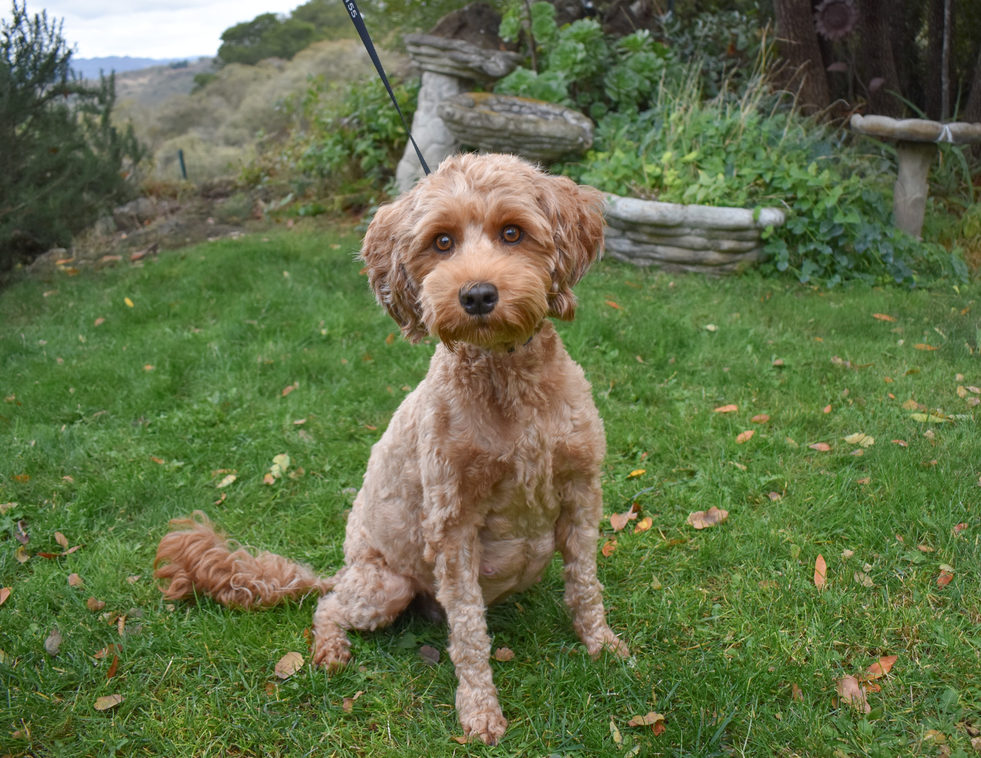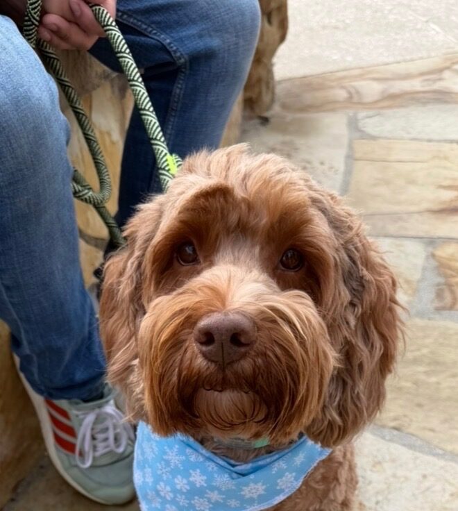 Finley is a caramel colored miniature sized Australian labradoodle at 25 pounds and 17 inches at the shoulder. Finley has been cleared OFA hips and elbows, and full Pawprint Panel for genetic diseases. Finley lives in a Guardian Home in Arroyo Grande, CA.