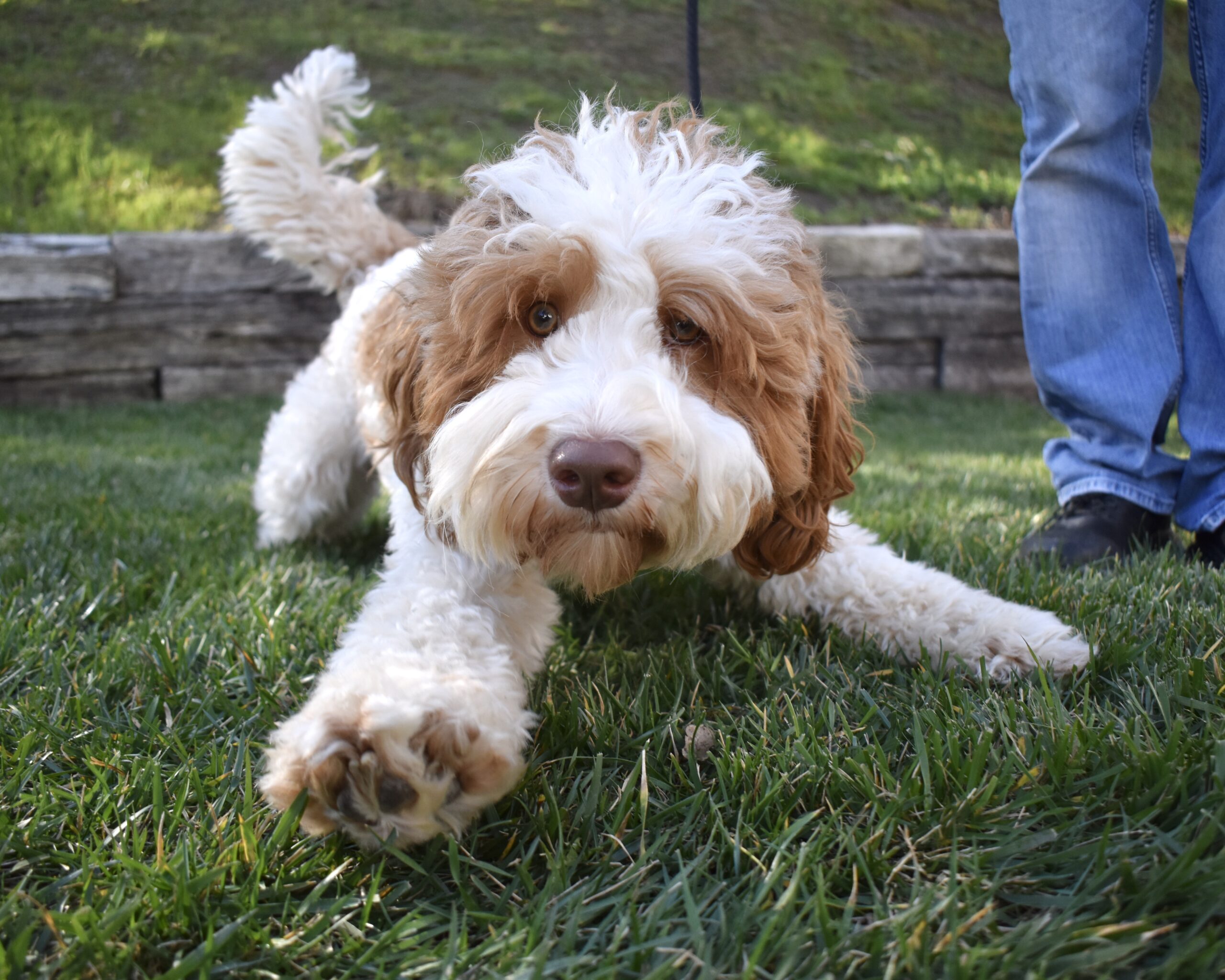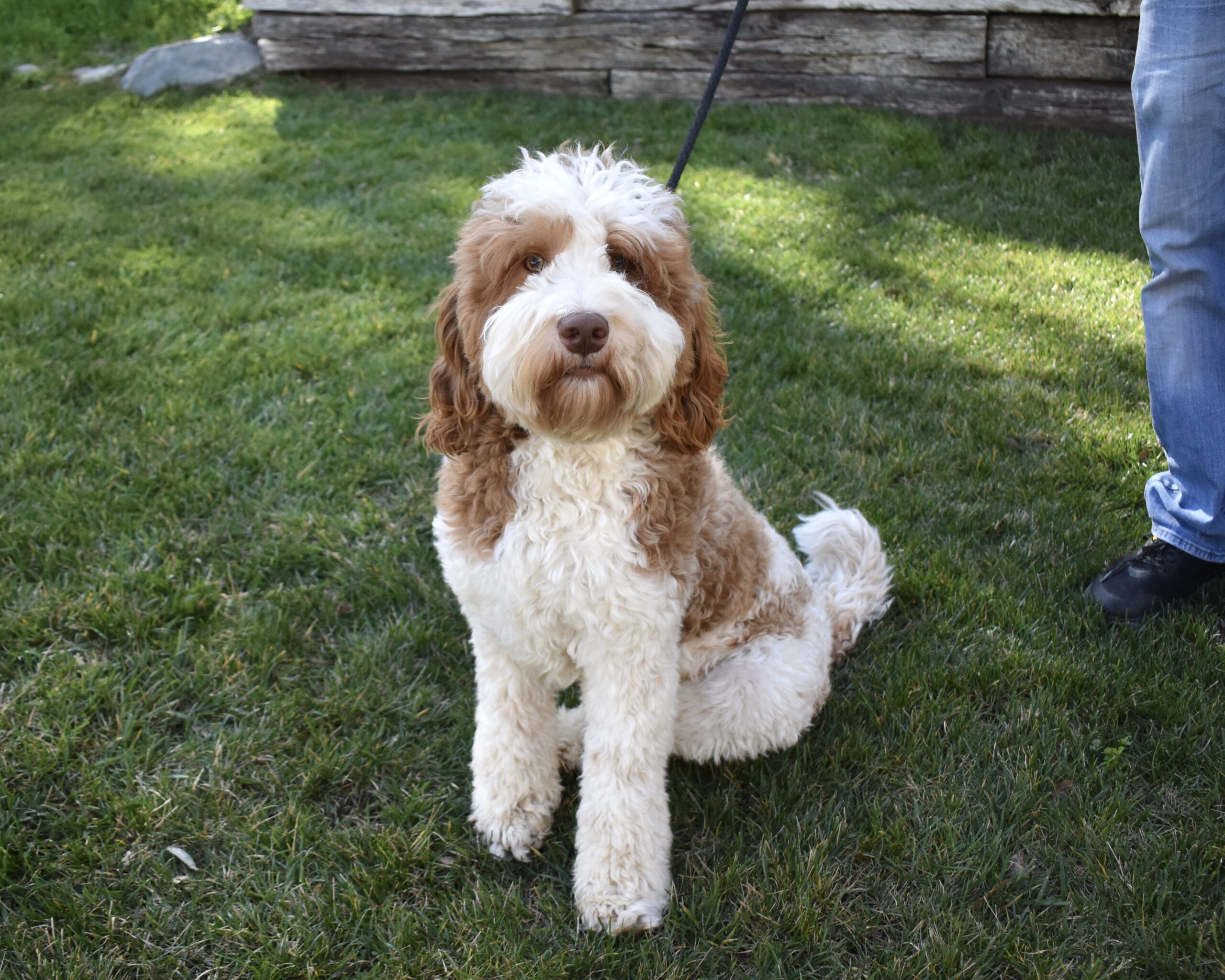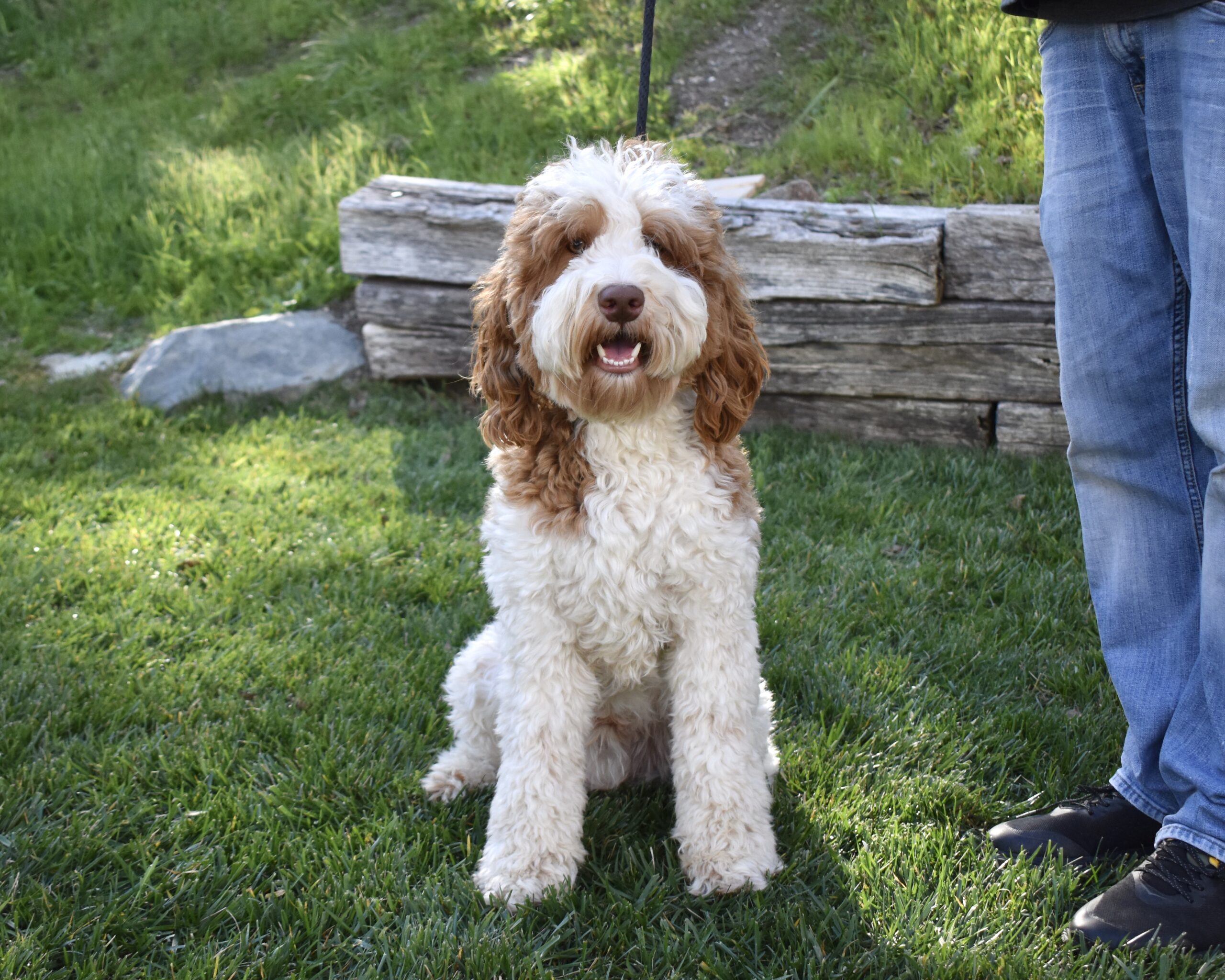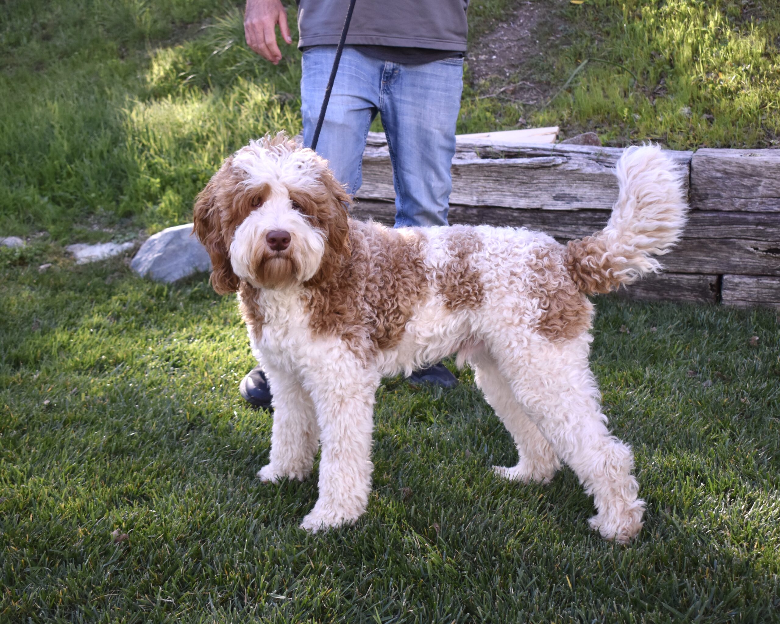 Maverick is a Caramel/Red & White parti colored small standard sized multigen Australian Labradoodle at 45 pounds and 21 inches at the shoulder. Maverick has been cleared OFA hips and elbows, full Pawprint Panel for genetic diseases, and CERF eyes. Maverick lives in a Guardian Home in Arroyo Grande, CA.